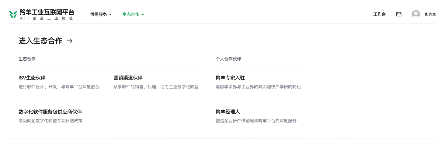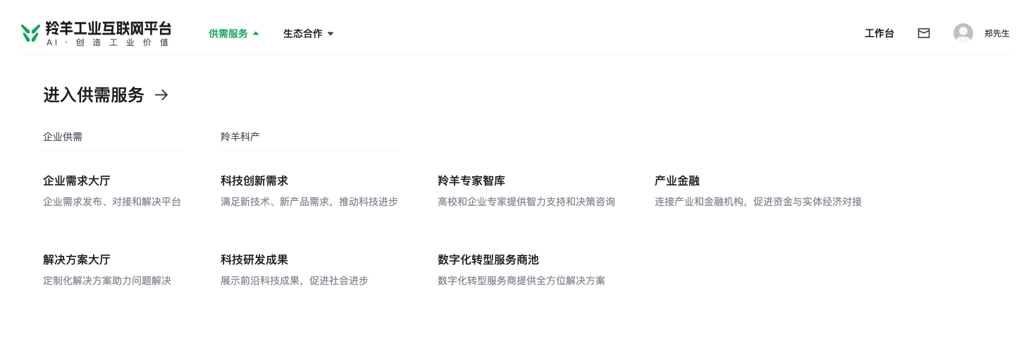 根据产品的需求,整体的信息架构层级设定为3/5级。首页作为扶持中小企业进行数字化转型平台的商场入口;“供需服务”是搭建在科研与生产之间的桥梁,助力科研成果产业化;“生态合作”接入更多的生态伙伴,一起服务于中小企业客户。