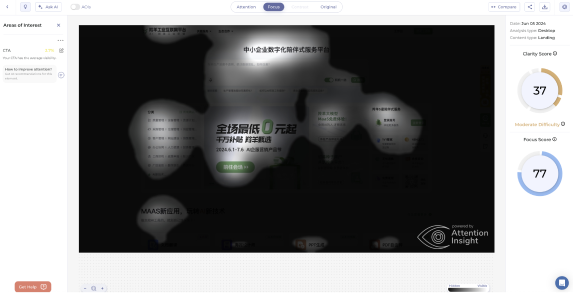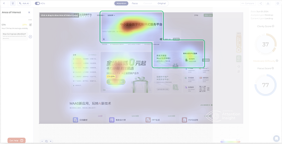 Attention-Insight“无人眼动仪”是一种基于人工智能的预测式眼动追踪技术,无需真实受试者或物理设备即可模拟人眼的注意力分布。其核心原理是利用深度学习模型,在数万张带有真实眼动数据的图像上训练出视觉注意力预测算法。用户只需上传网页、广告、包装等设计图,系统便会在几秒内生成“热力图”“焦点图”等结果,显示哪些区域最能吸引视线,并给出清晰度与焦点评分。相比传统眼动实验,大幅降低了时间和成本,适合在设计早期快速验证视觉层次与信息优先级,该技术的预测准确率可达90%以上。通过模拟人类第一眼的注意模式,设计师可以判断标题、按钮或Logo是否被及时看到,从而优化布局与转化效果,为设计提供了高效、低成本的决策依据。