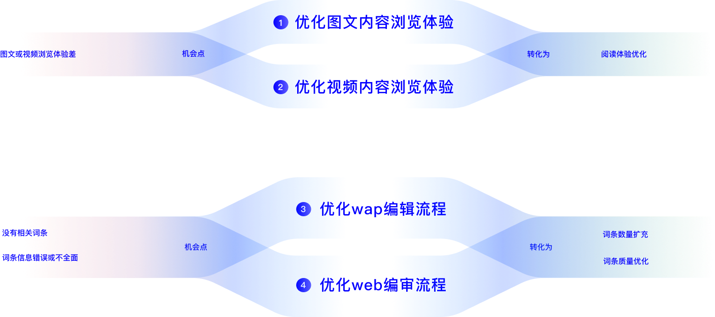 通过绘制用户旅程地图,来可视化用户在使用百科产品中产生的痛点,并以此来推进体验优化。绘制的程主要通过多种方式的用户研究与实际业务的数据复盘,经过总结发现用户的行为逻辑和痛点有:普通用户的图文/视频的浏览体验,百科内容创作者的编辑体验与审核体验。